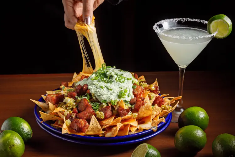 In the heart of NYC, Taqueria Diana dishes out nachos that are as bold as the city itself. Served on a half-sheet pan (yes, really), these crunchy towers of tortilla chips come smothered in cheese, beans, salsa, and your choice of carnitas, rajas, or al pastor. Add crema and guacamole if you’re feeling fancy.